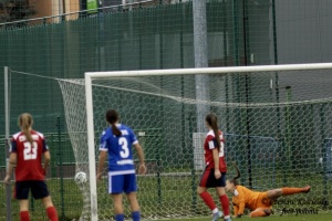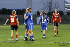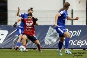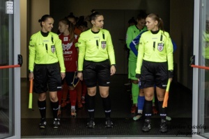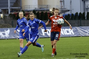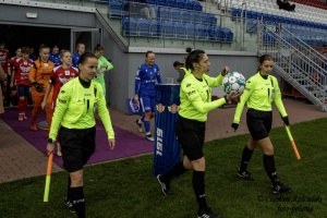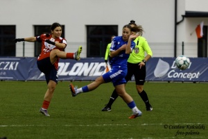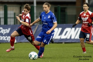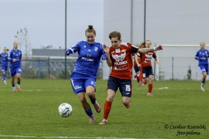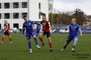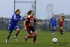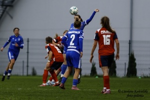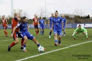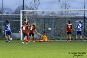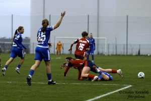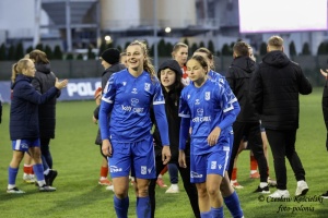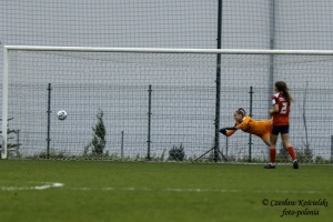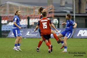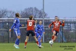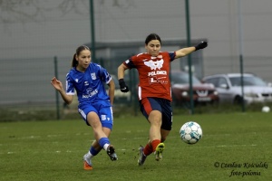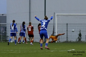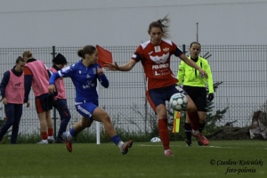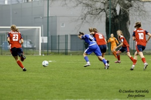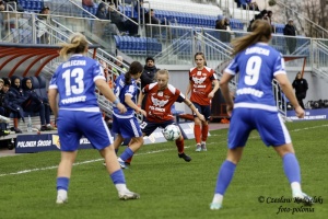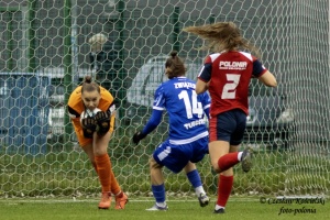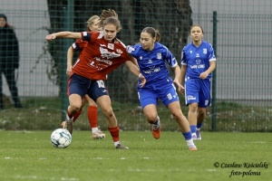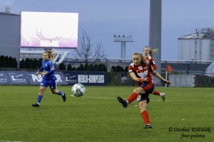 Spotkanie którego stawką był awans do 1/8 finału pucharowych rozgrywek lepiej rozpoczęły polonistki. Już w 5 minucie po indywidualnym rajdzie bliska szczęścia była Daria Nowak ale jej uderzenie z ostrego kąta przeleciało minimalnie nad poprzeczką bramki rywalek. W odpowiedzi w doskonałej sytuacji znalazła się Klaudia Wojtkowiak ale jej uderzenie w ostatniej chwili zablokowała wracająca za rywalką Magdalena Falkowska. W 25 minucie w kolejnej dobrej sytuacji strzeleckiej znalazła się Daria Nowak ale jej strzał z około 16 metrów był niecelny. Co nie udało się polonistkom zrobiły rywalki. W 34 minucie Liwia Prochwicz uderzyła precyzyjnie z około 20 metrów i piłka po raz pierwszy w tym meczu wpadła do średzkiej bramki. Polonistki nie zdążyły otrząsnąć się po stracie jednego gola a już przegrywały 0:2. Tym razem precyzyjnym strzałem sprzed pola karnego popisała się Klaudia Wojtkowiak. Prowadzeniem 2:0 lechitek zakończyła się pierwsza część spotkania.